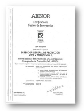 El CENEM cumple en sus actuaciones y procedimientos con los máximos estándares de exigencia y excelencia, y así han quedado acreditados a través del Certificado de calidad de AENOR de la Norma 22320:2013 UNE-ISO para la ‘Protección y seguridad de los ciudadanos y Gestión de Emergencias’, lo que permite el mantenimiento y la mejora continua de la gestión de emergencias y por tanto en el servicio por y para los ciudadanos.